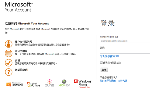 使用这个账户,用户可以轻松管理多种微软账户类型,包括MSN、Windows Live、Windows Phone、Xbox、Zune。该账户允许用户查看通过微软在线服务进行的购物,以及更新账户信息。